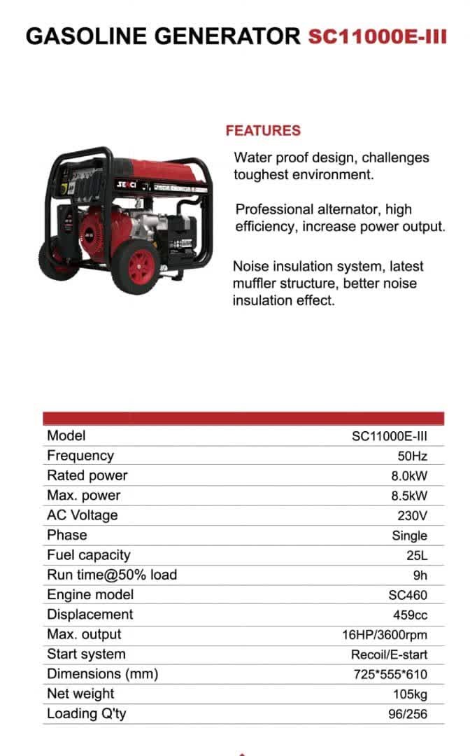 موتور برق بنزینی سنسی 8.5 کیلووات مدل SC11000E-III – قدرت، پایداری و کارایی بالا